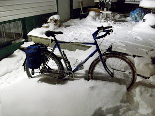 So it was a surprise to get some snow this past Sunday (12/19) as I was leaving work around 4pm. I would say "pleasant", but I was riding my bike home that night. Now I do have a snow/ice bike setup, a studded front tire and a cross-style rear that I put on my Surly Long Haul Trucker when the forecast calls for winter weather. If I lived in a truly winter climate like this guy I would have a bike set up exclusively for snow in winter, but right now I install/de-install the setup on the Trucker when it's needed. And since this snow was NOWHERE IN THE FORECAST, I was riding the Trucker with normal tires.