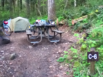 The weather couldn't have been better for my first bike camping excursion* of the year. (Okay, I did "bike camp" over New Years, but it was cabins, so I don't think it counts.) Sunny, high 60-70F both days. The only bad thing I can say is my lack of preparedness. Rather than smartly pack the night before, I threw everything into panniers on Saturday morning. Now this wouldn't be so bad if I was doing a solo expedition or riding with April, but when I'm leading a ride...let's say there were some antsy people waiting at the Cleveland Ave MAX station (the ride "muster point") when I arrived twenty minutes late!